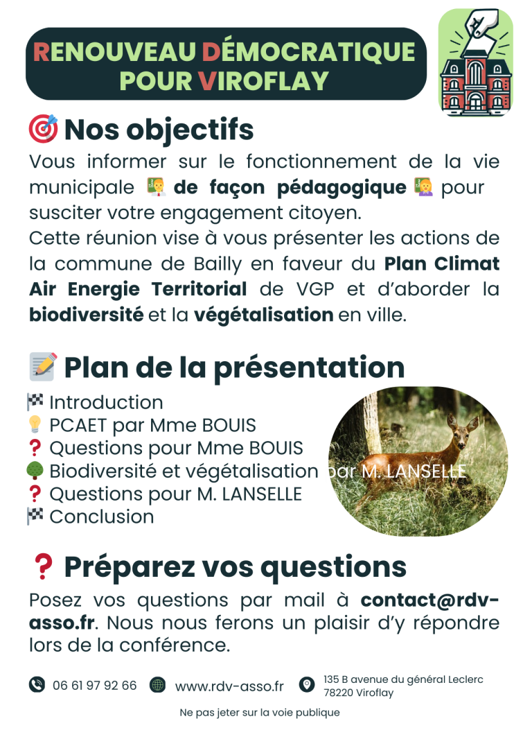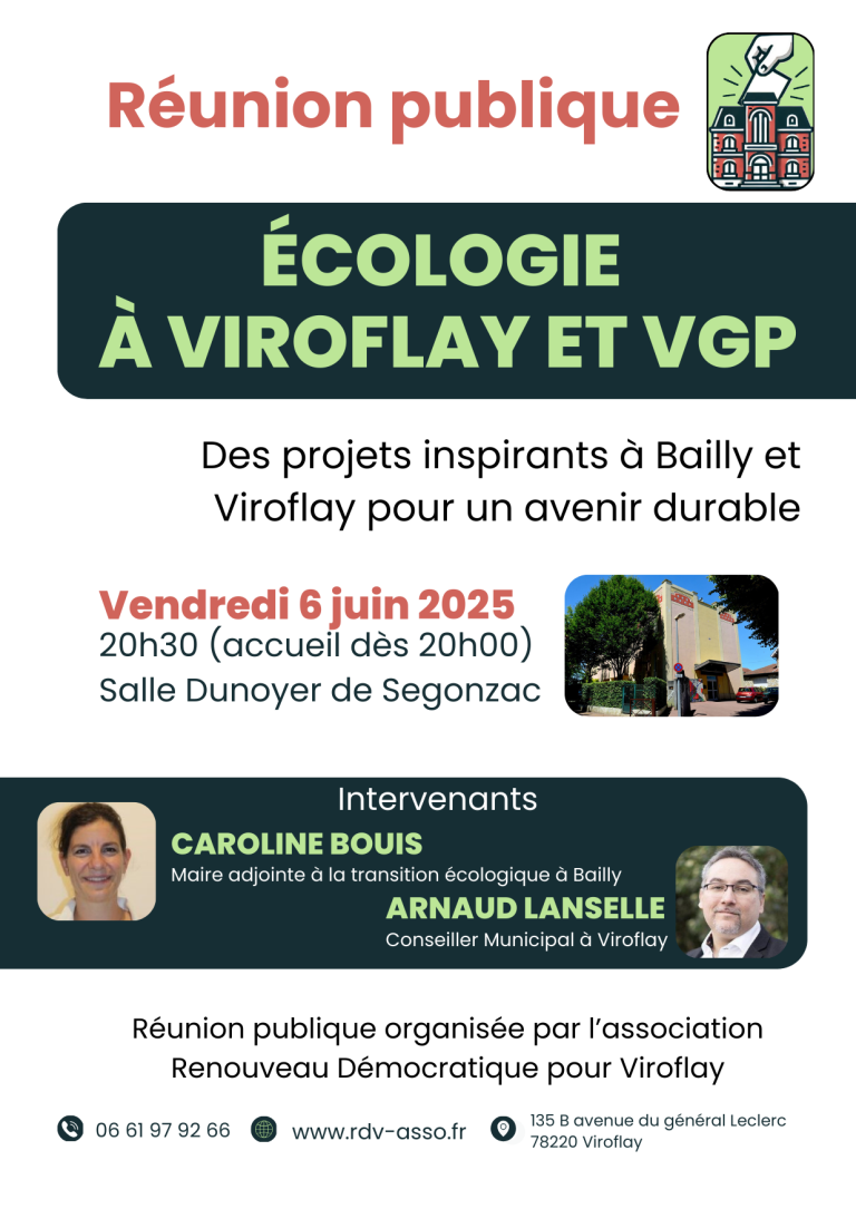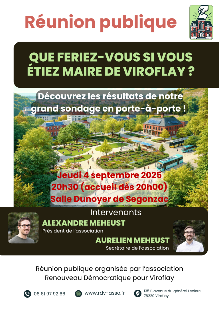 L'association Renouveau Démocratique pour Viroflay est ravie de vous annoncer une réunion publique pour discuter des résultats de notre grand sondage en porte-à-porte ! 🏡📊